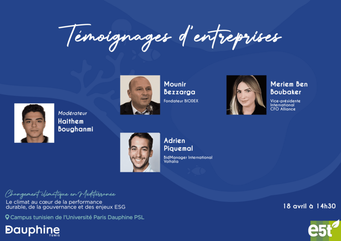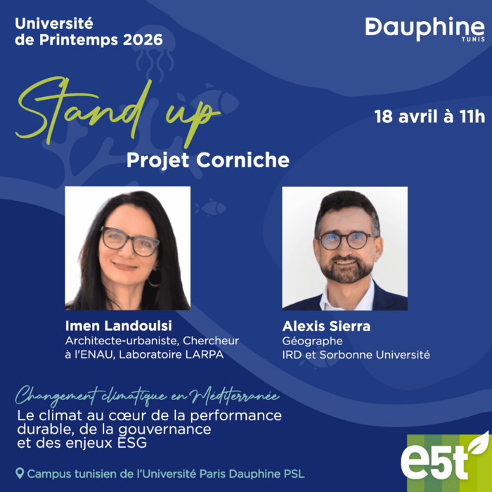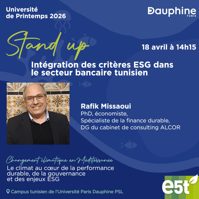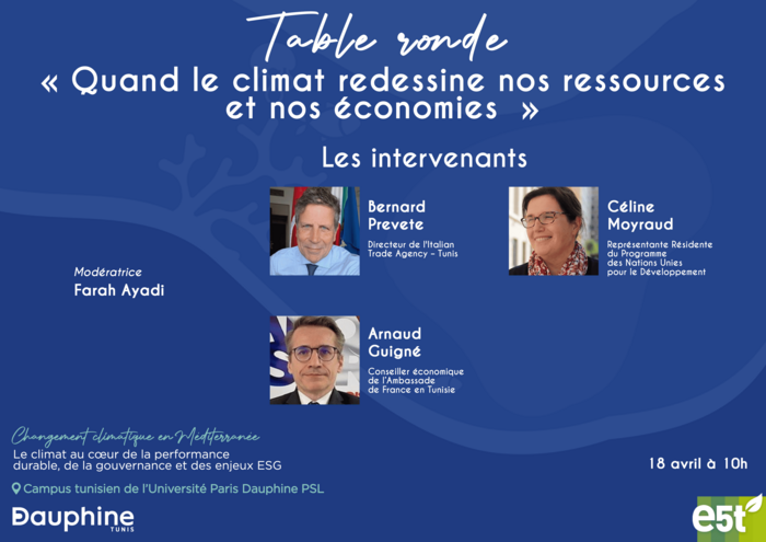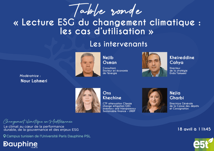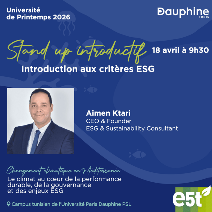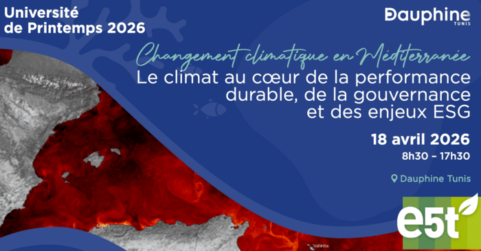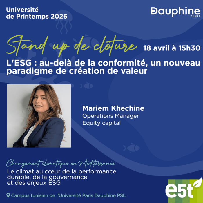 En présence de la Directrice Générale du campus tunisien de l’Université Paris Dauphine-PSL, Amina Bouzguenda Zeghal et de la Présidente fondatrice de E5T, Myriam Maestroni, cette conférence sera sous le thème : « Le climat au cœur de la performance durable, de la gouvernance et des enjeux ESG »