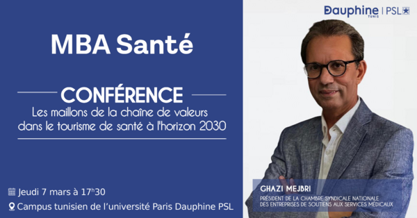 Dans le cadre de son MBA Santé, le campus tunisien de l’Université Paris Dauphine-PSL reçoit Ghazi Mejbri, Président de la chambre syndicale des entreprises de soutiens aux services médicaux pour une conférence sur le thème « Les maillons de la chaîne de valeurs dans le tourisme de santé à l'horizon 2030 »