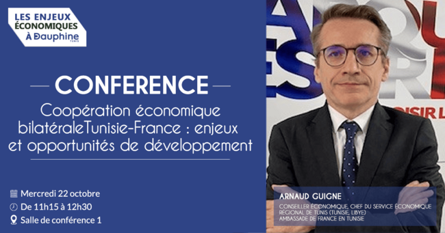 Le Campus tunisien de l’Université Paris Dauphine-PSL accueillera Arnaud Guigné, Chef du Service économique régional de Tunis à l’Ambassade de France. Fort de son expertise et de sa connaissance approfondie des liens économiques franco-tunisiens, il viendra exposer les grands axes de la coopération économique bilatérale Tunisie-France, en mettant en lumière les enjeux actuels ainsi que les opportunités de développement.