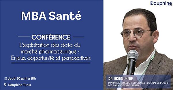 Cette conférence propose un éclairage complet sur les enjeux stratégiques, réglementaires et éthiques liés à l’exploitation des données dans l’industrie pharmaceutique. Elle sera animée par le Dr Ihsen MNIF, pharmacien, Président du Conseil régional de l'ordre des pharmaciens de l'Ariana. Titulaire d'un MBA international de l'Université Paris Dauphine-PSL, le Docteur Mnif enregistre une expérience de plus de 15 ans au sein de laboratoires pharmaceutiques internationaux où il a occupé différentes fonctions : National Sales Manager des laboratoires Actavis, National sales Manager/Membre du Codir des laboratoires Novo Nordisk Tunisie et Business Manager Tunisie des laboratoires TAKEDA.