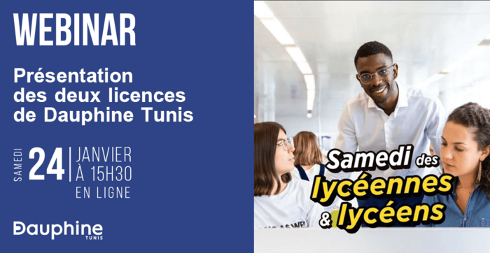 En parallèle de cette Journée Portes Ouvertes en présentiel, un webinar sera proposé pour les futurs bacheliers résidant à l’étranger ou ne pouvant se déplacer à Dauphine Tunis. Cette session s’inscrit dans le cadre de la Semaine des lycéennes et lycéens de l’Université Paris Dauphine PSL, le samedi 24 janvier à 15h30.