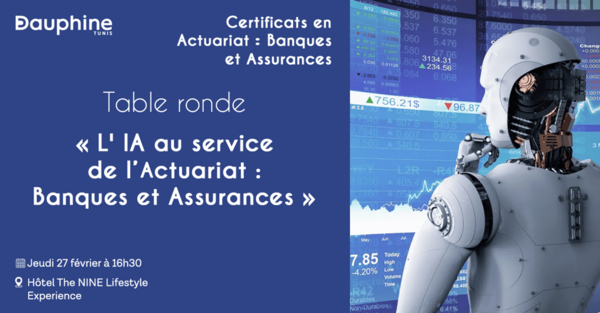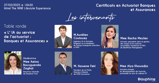 Dans le cadre de ses certificats en actuariat, Banque et Assurances, le campus tunisien de l’Université Paris Dauphine-PSL organise une Table ronde sur le thème « L’IA au service de l’actuariat : Banque et Assurances ». A l’heure du Sommet de Paris sur l’IA qui a réunit des experts et des décideurs du monde entier pour discuter de la maîtrise et développement de cette technologie, Dauphine Tunis questionne l’apport de l’IA dans les métiers de l'actuariat en réunissant un panel d’experts pour une table ronde. Quelles sont les contributions de l’IA à ces métiers ? Dans quelles mesures les algorithmes d’apprentissage automatique, tel que le machine learning, permettent-ils déjà d’affiner les modèles prédictifs ? Comment l’IA peut-elle contribuer à une tarification dynamique qui ajuste les prix des assurances en temps réel en fonction du comportement et des risques associés à chaque client ? Toutes ces questions et bien d’autres encore seront abordés par nos invités.