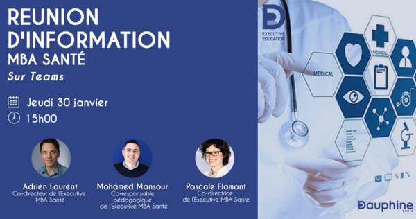 Le département Executive Education de Dauphine Tunis organise une réunion d’information en ligne pour présenter aux professionnels de santé, des secteurs médicaux et pharmaceutiques, son programme de MBA dédié.